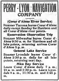 - Perry-Lyon Navigation Company. Formed in April 1909 by the merger of the former competitors, the Perry and the Lyon companies.[34] The new concern would operate the Lyons boats (Tacoma and Lyondale) and the Perry boats (Milwaukee and Spray).[34] Formally incorporated on April 19, 1910.[35]