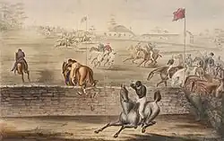 The steeplechase originated in Ireland in the 18th century as an analogue to cross-country thoroughbred horse races which went from church steeple to church steeple, hence "steeplechase". The first steeplechase is said to have been the result of a wager in 1752 between Cornelius O'Callaghan and Edmund Blake, racing four miles (6.4 km) cross-country from St John's Church in Buttevant to St Mary's Church (Church of Ireland) in Doneraile, in County Cork, Ireland.[1] An account of the race was believed to have been in the library of the O'Briens of Dromoland Castle. Most of the earlier steeplechases were contested cross-country rather than on a track, and resembled English cross country as it exists today. The first recorded steeplechase over a prepared track with fences was run at Bedford in 1810, although a race had been run at Newmarket in 1794 over a mile (1600 m) with five-foot (1.5 m) bars every quarter mile (400 m).[2] and the first recorded steeplechase of any kind in England took place in Leicestershire in 1792, when three horses raced the eight miles from Barkby Holt to Billesdon Coplow and back.[3]