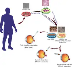 - ^ Yang YP, Hsiao YJ, Chang KJ, Foustine S, Ko YL, Tsai YC, et al. (November 2022). "Pluripotent Stem Cells in Clinical Cell Transplantation: Focusing on Induced Pluripotent Stem Cell-Derived RPE Cell Therapy in Age-Related Macular Degeneration". International Journal of Molecular Sciences. 23 (22): 13794. doi:10.3390/ijms232213794. PMC 9696562. PMID 36430270.