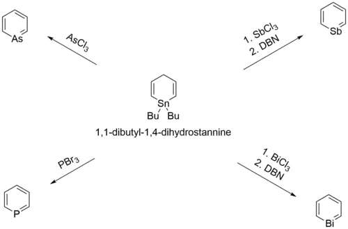 It is noted that other benzene derivatives with one carbon replaced with a group 15 element can be synthesized via a similar synthetic pathway to that which stibabenzene is synthesized. The reaction of 1,1-dibutyl-1,4-dihydrostannine with arsenic trichloride, phosphorus tribromide, or bismuth trichloride can yield arsabenzene, phosphabenzene, or 1-chloro-1-bismacyclohexa-2,5-diene respectively. Treatment of 1-chloro-1-bismacyclohexa-2,5-diene with a base, such as DBN, can yield the product bismabenzene.[3]