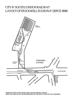 - ^ Greathead's plan presented to the Institution of Civil Engineers, shows the depot and generating station were on the east side of Clapham Road/Kennington Park Road, approximately where Stockwell Gardens is today.