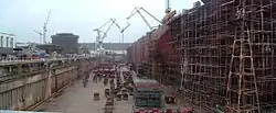 After sustaining bombing damage during World War II the shipyard was rebuilt and expanded. In 1963, its first dry dock was finished, with dimensions 240 × 40 m. A second drydock with dimensions 380 × 70 m was finished in 1976.