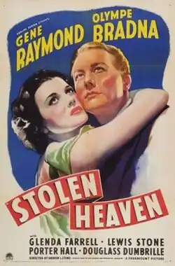Stolen Heaven is a 1938 American drama film directed by Andrew L. Stone and written by Eve Greene, Frederick J. Jackson and Stone. The film stars Gene Raymond, Olympe Bradna and Glenda Farrell. The film was released on May 13, 1938, by Paramount Pictures.[1][2] The screenplay concerns two jewel thieves who pose as musicians to elude pursuing law officers.