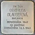 Gertruda Glauberová née Zinner, also called Gertrude or Trude, was born on 24 August 1909 in Hlinsko. Her parents were Ludwig Zinner and Stefanie née Bergmann, also Steffi. She had a sister named Marianna, born on 20 March 1906, later married as Kraus. She married Valtr Glauber (see above). The couple had a son, Karel, born in 1937 (see above). She was arrested, separated from her child and deported to Auschwitz concentration camp. There she was murdered on 16 January 1943.[16]