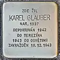 Karel Glauber, also Karl, was born on 14 June 1937 in Horažďovice. His parents were Valtr Glauber and Gertruda née Zinner (see below). On 26 November 1942, the boy was deported from Klatovy to Theresienstadt concentration camp by transport Cd. His transport number was 124 of 651. His mother was deported to Auschwitz concentration camp and murdered there on 16 January 1943. The little boy was deported on 18 December 1943 to Auschwitz by transport Ds. His transport number was 2219 of 2,503. There the Nazis took the life of the six years old boy.[11][12]
