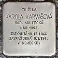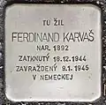 Horná Ulica 107/55 | Ferdinand Karvaš was born on 2 June 1892. He worked as a medical practitioner in Horná Ulica of Banská Bystrica and was also a head physician in a spa in nearby Brusno. He was married to Karola née Skutecká, a painter (see below). The couple had one son, Peter Karvaš (born on 25 April 1920). After the suppression of the Slovak National Uprising, he and his wife were seized by the Gestapo in Banská Bystrica on 18 December 1944, imprisoned, deported to Germany and executed there on 9 January 1945.[6]