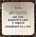 JÁN BAKOSS BORN 1895 ARRESTED 5.1.1945 IN MARTIN MURDERED 31.1.1945 |