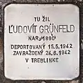 L'UDOVÍT GRÜNFELD BORN 1890 DEPORTED 15.5.1942 MURDERED 24.6.1944 IN TREBLINKA |