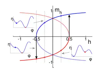 Since the magnetization in the direction of the field is Ms cos φ, these curves are usually plotted in the normalized form mh vs. h, where mh = cos φ is the component of magnetization in the direction of the field. An example is shown in Figure 2. The solid red and blue curves connect stable magnetization directions. For fields −1/2 ≤ h ≤ 1/2, the two curves overlap and there are two stable directions. This is the region where hysteresis occurs. Three energy profiles are included (insets). The red and blue stars are the stable magnetization directions, corresponding to energy minima. Where the vertical dashed lines intersect the red and blue dashed lines, the magnetization directions are energy maxima and determine the energy barriers between states.[1]
