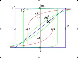 The shape of the hysteresis loop has a strong dependence on the angle between the magnetic field and the easy axis (Figure 3). If the two are parallel (θ = 0), the hysteresis loop is at its biggest (with mh = hs = 1 in normalized units). The magnetization starts parallel to the field and does not rotate until it becomes unstable and jumps to the opposite direction. In general, the larger the angle, the more reversible rotation occurs. At the other extreme of θ = 90°, with the field perpendicular to the easy axis, no jump occurs. The magnetization rotates continuously from one direction to the other (it has two choices of rotation direction, though).