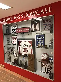 The Stony Brook Seawolves are the intercollegiate athletics teams that represent Stony Brook University (SBU) in Stony Brook, New York. The Seawolves play as members of the Coastal Athletic Association (formerly known as the Colonial Athletic Association), which competes at the NCAA Division I level. Stony Brook had previously been a part of the America East Conference from 2001 to 2022, though has competed in CAA Football since 2013.[2] The university's mascot is Wolfie the Seawolf, and the official colors of the Seawolves are red, grey, and blue.