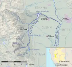 Black Butte Lake, formed by Black Butte Dam in Tehama County, is the largest reservoir on Stony Creek, covering more than 4,000 acres (1,600 ha) in the lower Coast Range foothills. A second tributary called North Fork Stony Creek joins in the reservoir from the west.[14] Downstream of Black Butte Dam surface water from Stony Creek is diverted into the Stony Creek Canal and other smaller ditches for irrigation.[15] The creek re-enters Glenn County, flowing in an east-southeast direction across the Sacramento Valley as a wide meandering stream.[16] North of Orland, the largest town in the watershed, it is crossed by Interstate 5.[17] It joins the Sacramento River south of Hamilton City and west of Chico at Sacramento river mile 190 (kilometer 306).[18]