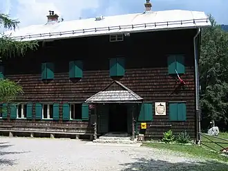The Storžič Lodge (Slovene: Dom pod Storžičem; 1,123 meters or 3,684 feet) is a mountain hostel in the upper part of the Lomščica Valley, near the Jesenje Pasture in northwestern Slovenia. The first lodge was built in 1938 and was called the Verbič Lodge (Verbičeva koča); it caught fire one year later. It burned in 1941 when German forces attacked the Storžič Battalion. The current brown shingled hut was built in 1951.