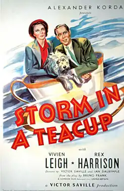 Storm in a Teacup is a 1937 British romantic comedy film directed by Ian Dalrymple and Victor Saville and starring Vivien Leigh, Rex Harrison (in his first starring role[2]), Cecil Parker, and Sara Allgood. It is based on the German play Sturm im Wasserglas by Bruno Frank, as well as the English-language adaptations: London's Storm in a Teacup and Broadway's Storm Over Patsy, both written by James Bridie.[3] A reporter writes an article that embarrasses a politician. Meanwhile, the newspaperman is also attracted to his target's daughter.