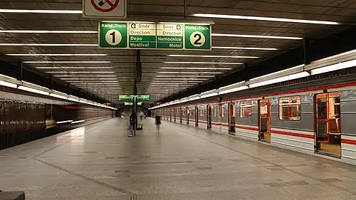 Strašnická (Czech pronunciation: [ˈstraʃɲɪtskaː]) is a Prague Metro station on Line A, located in Strašnice, Prague 10. It was opened on 11 July 1987 as the eastern terminus of the extension from Želivského. On 4 July 1990, the line was extended to Skalka.[1] The station is located under Starostrašnická Street, 7.5 m (25 ft) below the surface. The station has only one concourse leading to Starostrašnická, which is connected to a fixed platform with stairs and a ramp for disabled passengers. The interior of the station is paneled with dark brown tiles. Construction of the station cost 241.4 million crowns.