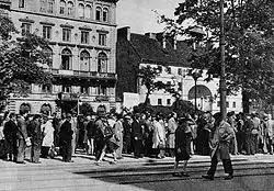 Large-scale roundups were not new to Warsaw residents. However, while they were previously organized to gather contingents of forced labor or to form transports to concentration camps, the victims of the October raids were treated as hostages.[22] On the morning of October 15, the first of many Kutschera's announcements (appearing anonymously as Commander of the SS and police for the Warsaw District) was made through street loudspeakers. The announcement reported the execution of 7 people and announced that for every injured German, 10 Poles would be executed – the same day and at the site of the attack. Additionally, a list of 60 hostages to be executed first was published (in announcements broadcast in the evening, this list expanded to 100 names). Among the hostages were several women.[15][32] The first street execution by the Germans took place the next day. Around 4:00 PM, 25 prisoners were taken from Pawiak, their hands tied with ropes and their eyes blindfolded with black bands. Five hostages were shot in the ruins of the ghetto, and the remaining twenty were executed at 141 Independence Avenue in Mokotów (between Madaliński and Różana streets).[25][33] On the night between October 16 and 17, another 9 prisoners were shot in the ghetto. The next day, another 25 hostages were taken from Pawiak. Five prisoners were murdered in the ghetto ruins, and the remaining twenty were executed next to the Telephone Directorate building at 17 Pius XI Street (now Piękna Street).[25][34] Street executions continued uninterrupted until mid-February 1944.