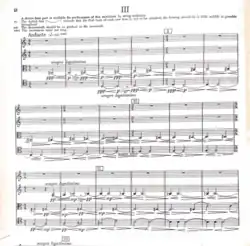 All four movements show varying degrees of organizational frameworks. Rather than relying on the technical capabilities of the instruments, Crawford relies on instrumental timbre and the balance of textures. The piece's anticipation of rhythmic techniques have been associated with Elliott Carter, while the independent and asymmetrical part writing has been attributed to Charles Seeger's method of dissonant counterpoint.[9][10]