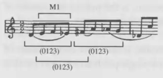 The harmony changes one note at a time, and that series of new notes creates the basic melodic line of the movement. The four instruments take turns introducing new notes, but does not follow any systematic pattern. Thus, the melody exhibits characteristics of Klangfarbenmelodie, with its instrumental timbre constantly shifting. One note is introduced and sustained until it is the same instrument's turn to play another one. The movement of melodies can be understood as harmonies produced by the after-effects of the sustained tones.[7]