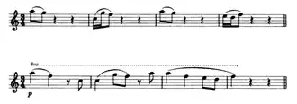 Dvořák quoted in the third movement, measures 21–24, a bird that he heard in Iowa. The song appears as a high, interrupting strain in the first violin part.[24] Dvořák was annoyed by this bird's insistent chattering, and transcribed its song in his notebook.[25] In the 1950s, an English musicologist identified the bird as a scarlet tanager - a claim that has been repeated in books ever since. However, American ornithologist Ted Floyd showed in 2016 that the bird quoted by Dvořák likely was not a scarlet tanager; instead, the bird was probably a red-eyed vireo, another American songbird.[26]