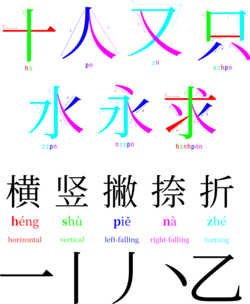 - ^ In the list 橫竖撇捺折 (héng-shù-piē-nà-zhé), the fourth stroke (捺; nà) is also sometimes called 点 (diǎn), i.e. 橫竖撇点折; 橫豎撇點折; héng-shù-piē-diǎn-zhé.