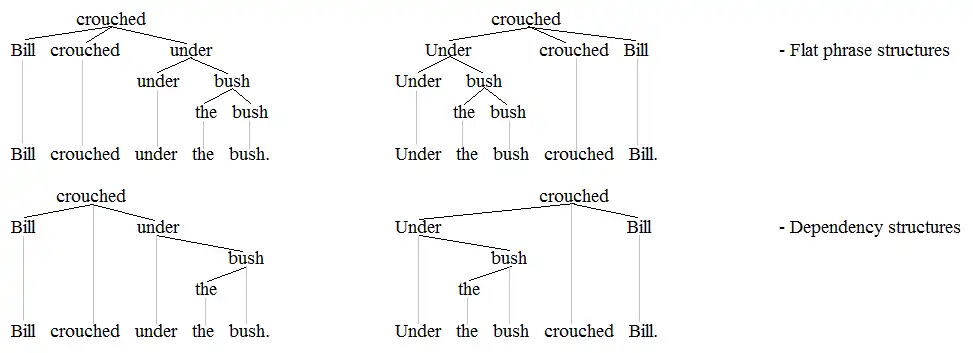The convention is used here where the words themselves appear as the labels on the nodes in the trees. The tree on the left shows the canonical analysis of the clause, whereby the sentence is divided into two immediate constituents, the subject Bill and the finite VP crouched in the bush. To maintain the integrity of the finite VP constituent crouched in the bush, one can assume a rearranging of the constituents in the second sentence on the right, whereby both crouched and in the bush move out of the VP and up the structure. The account suggested with the second tree is the sort of analysis that one is likely to find in Government and Binding Theory or the Minimalist Program. It is a phrase structure account that relies on unseen movement/copying mechanisms below the surface.
