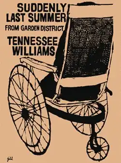Suddenly Last Summer is a one-act play by Tennessee Williams, written in New York in 1957.[1] It opened off Broadway on January 7, 1958, as part of a double bill with another of Williams' one-acts, Something Unspoken (written in London in 1951).[2]:  52  The presentation of the two plays was given the overall title Garden District, but Suddenly Last Summer is now more often performed alone.[3] Williams said he thought the play "perhaps the most poetic" he had written,[2]:  86  and Harold Bloom ranks it among the best examples of the playwright's lyricism.[4]