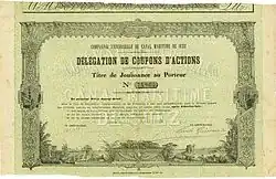 The Suez Company or Suez Canal Company, full initial name Compagnie universelle du canal maritime de Suez (Universal Company of the Maritime Canal of Suez),[1] sometimes colloquially referred to in French as Le Suez ("The Suez"),[2][3] was a company formed by Ferdinand de Lesseps in 1858 to operate the Egyptian granted concession of the Suez Canal, which the company built between 1859 and 1869. Initially, French investors held half of the Company's stock, with Egypt's ruler Sa'id Pasha holding most of the balance. In 1875, financial distress forced Sa'id's successor Isma'il Pasha to sell the country's shares to the government of the United Kingdom. The Suez Company operated the canal until Egypt's new president Gamal Abdel Nasser revoked its concession in 1956 and transferred canal operation to the state-owned Suez Canal Authority, precipitating the Suez Crisis.
