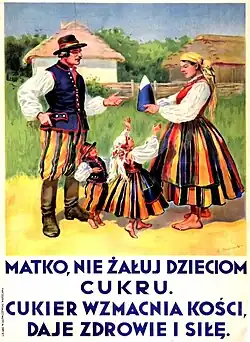 In 1925, the Sugar Consumption Propaganda Commission (Polish: Komisja Propagandy Konsumpcji Cukru, KPKC) was established in Second Polish Republic, headed by Hipolit Liciński.[1] The main objective of the commission was to increase sugar consumption through various propaganda activities and cooperation with state institutions.[2] One of the KPKC's tools was the introduction of promotional materials such as leaflets, books and advertising slogans to convince the public to consume more sugar. These materials often featured stories and characters to serve as examples, and the number of propaganda slogans invented was impressive. During this, many works of the type were created: Poradnik dla gospodyń, W jaki sposób otrzymuje się cukier i jakie ma on znaczenie dla człowieka, Cukier i jego własności odżywcze, Co każdy powinien wiedzieć o cukrze.[3] To support sales, the KPKC collaborated with the Sugar Bank, and its actions were inspired by solutions used in other countries.[4]