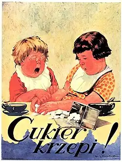 In 1930, the KPKC set up a new institution, Bureau of Propaganda for the Consumption of Sugar (Biuro Propagandy Konsumpcji Cukru, BKPC), to organise a more effective promotional campaign. The bureau was headed by Melchior Wańkowicz, a well-known publicist and propagandist at the time.[10] The BKPC's activities were aimed at improving the image of sugar in society and increasing its consumption. Learning from the BKPC's earlier failures, it focused on a wider range of activities, directing the campaign particularly to the Eastern Borderlands, where sugar was also popularised among the Ukrainian minority.[11] Despite the difficult economic situation associated with the Great Depression, the campaign was extensive and conducted with the cooperation of the Polish government.[12] New propaganda tools were introduced, including numerous posters and slogans.[13] The most well-known of these became the slogan Cukier krzepi ('Sugar strengthens [you]'), which quickly gained popularity.[14] Propaganda material was placed in the press,[15] on the radio[16] and on signs and billboards.[17] Slogans promoting sugar and stigmatising saccharin also appeared in Ukrainian, and the fight against saccharin continued as one of the main elements of the campaign.[18]
