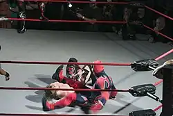Suicide is a professional wrestling persona, used by multiple wrestlers in Total Nonstop Action Wrestling (TNA). Suicide first appeared as a character in the 2008 video game TNA Impact!. In December 2008, the Suicide character was introduced on television as a real-life wrestler. Originally portrayed by Frankie Kazarian, Christopher Daniels held the role for a time in early 2009 and went on to win the X Division Championship.[2] In June 2010, Kiyoshi became the third man to use the gimmick.[3]