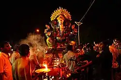 Sukhakarta Dukhaharta (literally "harbinger of happiness and dispeller of distress",[1] Marathi: सुखकर्ता दु:खहर्ता, sukhakartā duḥkhaharta), also spelled as Sukhkarta Dukhharta, is a popular Marathi arati, song or bhajan (devotional song) dedicated to the Hindu god Ganesha, composed by the saint Samarth Ramdas (1608 - 1682 CE).[2][3] It is included in the "most standard and almost universal" aarti songs sung at the start of Puja (worship rituals) of Ganesha in Maharashtra, especially in his festival Ganesh Chaturthi as well as in Ganesha temples in the region.[1][3][4]