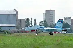 Apart from the single-seat design, a two-seat aircraft was also constructed. Working in cooperation with Sukhoi, KnAAPO's own engineers designed the Su-35UB so as to combine thrust-vectoring engines with features of the Su-27M. Modified from an Su-30MKK airframe, the aircraft made its first flight on 7 August 2000, and afterwards served as an avionics test-bed.[31] While the original Su-27M never entered mass production due to a lack of funding,[32] Sukhoi refined the Su-27M's use of canards and the Su-37's thrust-vectoring technology and later applied them to the Su-30MKI two-seat fighter for the Indian Air Force.[33] The tenth Su-27M (T10M-10) also served as a test-bed for the Saturn AL-41F1 engine that is intended for the Sukhoi Su-57 (previously known under the acronym "PAK FA") jet fighter.[34]