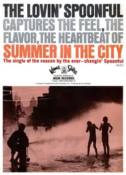 "Summer in the City" is a song by the Canadian-American folk-rock band the Lovin' Spoonful. Written by John Sebastian, Mark Sebastian and Steve Boone, the song was released as a non-album single in July 1966 and was included on the album Hums of the Lovin' Spoonful later that year. The single was the Lovin' Spoonful's fifth to break the top ten in the United States, and the only one by the group to reach number one. A departure from the band's lighter sound, the recording features a harder rock style. The lyrics differ from most songs about the summer by lamenting the heat, contrasting the unpleasant warmth and noise of the daytime with the relief offered by the cool night, which allows for the nightlife to begin.