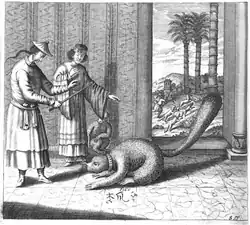 Sumxu, described as "similar to cats" in Athanasius Kircher's China Illustrata. The Chinese caption, 松鼠, has suffered in the process of being copied by an artist not familiar with Chinese script