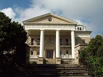 Sunrise, also known as MacCorkle Mansion, is a historic home located at Charleston, West Virginia. It was built in 1905 by West Virginia's ninth governor, William A. MacCorkle (1857-1930). It is a long, three-story stone mansion. Its gabled roof is dotted with dormers and chimneys and surmounts an intricate, but wide, cornice which gives the illusion that the house is smaller than it actually is. The Georgian structure rests on a bluff overlooking the Kanawha River, and from the northern portico one can see nearly the entire city of Charleston. The north side features four magnificent Doric, or neo-classic, columns which support the cornice and ashlar-finished pediment. In 1961 Sunrise Foundation, Inc., was formed for the purpose of purchasing the mansion and grounds.[2]
