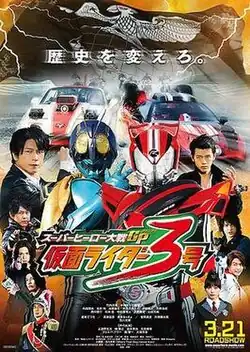 Super Hero Taisen GP: Kamen Rider 3 (スーパーヒーロー大戦GP 仮面ライダー3号, Supā Hīrō Taisen Guranpuri Kamen Raidā Sangō) is the 2015 entry of the Super Hero Taisen film series, featuring the cast of Kamen Rider Drive and the appearance of Kamen Rider 3, which was originally created by Shotaro Ishinomori for the one-shot 1972 manga Rider #3 VS. General Black (3ごうライダーたい ブラックしょうぐんのまき, Sangō Raidā Tai Burakku Shōgun no Maki). Tetsuo Kurata, (Kamen Rider Black, Kamen Rider Black RX), Yuichi Nakamura (Kamen Rider Den-O), Kousei Amano, Takayuki Tsubaki, Ryoji Morimoto and Takahiro Hojo (Kamen Rider Blade), and Kento Handa (Kamen Rider 555) reprise their roles in the film, which opened in theaters on March 21, 2015.[2][3] A new actor Mitsuhiro Oikawa, confirmed to perform his role as Kamen Rider 3, as well as the cast of Shuriken Sentai Ninninger will also appear.