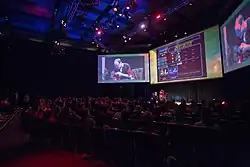Competitive Melee experienced a resurgence in popularity and support after it was again hosted at EVO 2013 after the game won a charity drive to decide the final game to be featured in its tournament lineup.[8][9] Due to its large turnout and viewership that year, EVO continued including Melee in its lineup for the next five years. The competitive scene was also further popularized by the 2013 release of The Smash Brothers documentary series directed by Travis "Samox" Beauchamp.[10] SmashBoards estimated that in 2014 around 3,242 events featuring a Smash Bros. game had occurred worldwide.[11] This period saw a number of new and revived major tournament series enter the scene, including GENESIS, Super Smash Con, Community Effort Orlando (CEO), DreamHack, Major League Gaming (MLG), Shine and the Smash Summit invitational series. Other major tournament series included Apex and The Big House. Apex 2015 was officially sponsored by Nintendo of America, marking the first official Nintendo sponsorship of a community-run event[12] while EVO 2016 was the largest Melee tournament of all time, with 2,376 entrants.[13] In June 2014 Nintendo held an invitational Super Smash Bros. for Wii U tournament at E3 2014 to promote the game, in which various competitive Smash Bros. players competed in a non-standard ruleset.[14] Smash Sisters, an initiative aimed at normalizing the participation of women at tournaments, held its first all-women bracket at GENESIS 3 in 2016.[15][16]