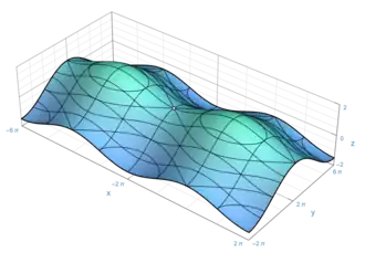 In the part of mathematics referred to as topology, a surface is a two-dimensional manifold. Some surfaces arise as the boundaries of three-dimensional solid figures; for example, the sphere is the boundary of the solid ball. Other surfaces arise as graphs of functions of two variables; see the figure at right. However, surfaces can also be defined abstractly, without reference to any ambient space. For example, the Klein bottle is a surface that cannot be embedded in three-dimensional Euclidean space.