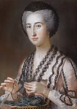 The countess died in 1783, aged 50. She was an artist in needlework whose “piece of flowers in needle-work” was considered sufficiently of interest to be exhibited publicly in 1768 by the Free Society of Artists, as was subsequently catalogued[7] by the publisher and art historian Algernon Graves. The portrait of her by William Hoare shows her holding yarn and she appears to be engaged in lace tatting. Her dress carries prominent black lace tatting decorations.
