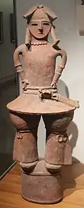 Amaterasu declares that the male deities were hers because they were born of her necklace, and that the three goddesses were Susanoo's.[21] Susanoo, announcing that he had won the trial,[a] thus signifying the purity of his intentions, "raged with victory" and proceeded to wreak havoc by destroying his sister's rice fields, defecating in her palace and flaying the 'heavenly piebald horse' (天斑駒, ame-no-fuchikoma), which he then hurled at Amaterasu's loom, killing one of her weaving maidens.[22][23][24] A furious Amaterasu in response hid inside the Ama-no-Iwato ("Heavenly Rock Cave"), plunging heaven and earth into total darkness. The gods, led by Omoikane-no-Kami (思金神), eventually persuade her to come out of the cave, restoring light to the world.[25][26] As punishment for his misdeeds, Susanoo is thrown out of Takamagahara:[27][28]