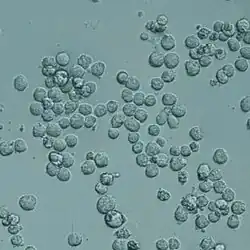 A cell suspension or suspension culture is a type of cell culture in which single cells or small aggregates of cells are allowed to function and multiply in an agitated growth medium, thus forming a suspension. Suspension culture is one of the two classical types of cell culture, the other being adherent culture. The history of suspension cell culture closely aligns with the history of cell culture overall, but differs in maintenance methods and commercial applications. The cells themselves can either be derived from homogenized tissue or from heterogenous cell solutions. Suspension cell culture is commonly used to culture nonadhesive cell lines like hematopoietic cells, plant cells, and insect cells.[1] While some cell lines are cultured in suspension, the majority of commercially available mammalian cell lines are adherent.[2][3] Suspension cell cultures must be agitated to maintain cells in suspension, and may require specialized equipment (e.g. magnetic stir plate, orbital shakers, incubators) and flasks (e.g. culture flasks, spinner flasks, shaker flasks).[4] These cultures need to be maintained with nutrient containing media and cultured in a specific cell density range to avoid cell death.[5]