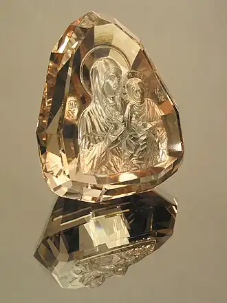 The works are presented by cameos and intaglios. First cameos of Nikitenko were carved of bone, then the artist started to process gemstones. The main raw materials are citrine, topaz, carnelian, morion and other hard gemstones.[7] In the middle of the 1990s Nikitenko started working on restoring of the traditions of the Christian glyptic,[8] which was developed in Byzantine Empire and was also spread in Kievan Rus'.[9] Some works of Nikitenko are devoted to the subjects of the Classical antiquity art, besides are presented by portraits The works are in own of Church and in private collections of many countries [10]