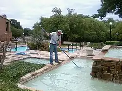 This swimming pool service technician is using a pool skimmer to remove debris from a courtyard fountain at an apartment complex in Tulsa, Oklahoma.