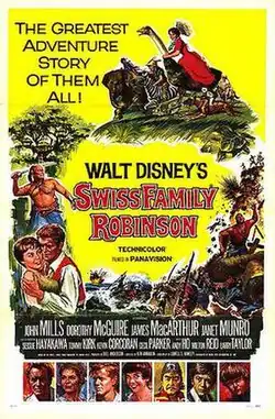 Swiss Family Robinson is a 1960 American adventure film starring John Mills, Dorothy McGuire, James MacArthur, Janet Munro, Tommy Kirk, and Kevin Corcoran in a tale of a shipwrecked family building an island home. It was the second feature film based on the 1812 novel The Swiss Family Robinson by Johann David Wyss, a previous adaptation having been released by RKO Pictures in 1940. Directed by Ken Annakin and shot in Tobago and Pinewood Studios outside London, it was the first widescreen Walt Disney Pictures film shot with Panavision lenses; when shooting in widescreen, Disney had almost always used a matted wide screen or filmed in CinemaScope.[3]