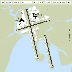By 1949, the airport had three runways – the 1,085-metre (3,560 ft) 11/29, the 1,190-metre (3,904 ft) 16/34, and the 1,787-metre (5,863 ft) 04/22. The Sydenham to Botany railway line crossed runway 04/22 approximately 150 metres (490 ft) from the northern end and was protected by special safe working facilities.[18]