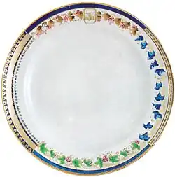 Hand painted Chinese porcelain dinner wares became the height of fashion in Europe and North America during the 18th century as a way showing off wealth and status in society.[1] The porcelain was ordered through different East India Companies and later independent American traders;[2] all Western trading companies with ships sailing to China.[2] The porcelain was decorated with a combination of Chinese patterns and Western motifs selected by its commissioner. The Chinese manufacturers sent porcelain samples of decorations to their prospective clients in Europe and the United States and their clients provided the porcelain painters in China with paintings, drawings or sketches for their orders.[3] These dinner wares are categorized into familles (French for "families") mainly by the colours they are painted in such as famille verte, noire, jaune and rose.[4]