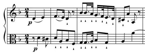 4 time, dominated by a motif established in the opening bars and consisting of two descending pairs of notes, firmly establishing the home key by using only notes in the D major triad.
