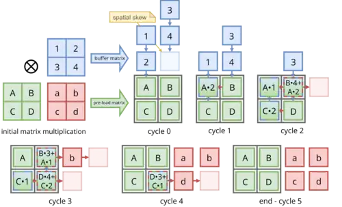 Systolic array algorithm pre-loading and keeping one operand stationary inside DPUs while computing. In the example, the green matrix is pre-loaded in the array and can be reused for subsequent multiplications.