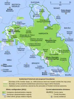 - ^ a b Sherrill Stroschein, Ethnic Struggle, Coexistence, and Democratization in Eastern Europe, Cambridge University Press, 2012, p. 210 Cited: "Székely, a Hungarian sub-group that is concentrated in the mountainous Hungarian enclave"