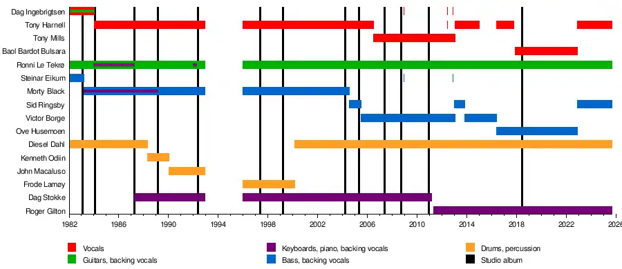 | Past members | Dag Ingebrigtsen Steinar Eikum Morty Black Kenneth Odiin John Macaluso Victor Borge Tony Mills Ove Husemoen Baol Bardot Bulsara |